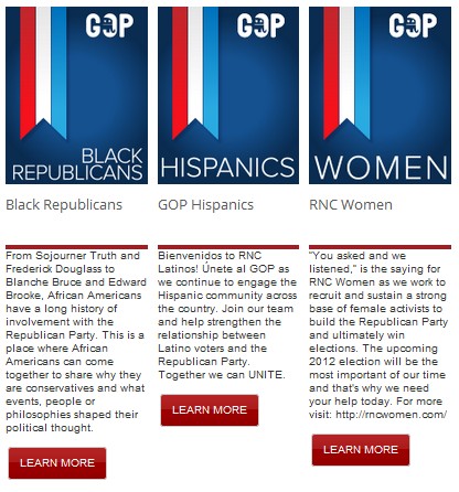 But perhaps the most obvious proof that the GOP is completely out of touch America in the 21st century is on its seriously bizarre Coalition Support page, which attempts to prove that black, Hispanic, and female Republicans exist in the real world. (In particular, the banner about “Black Republicans” makes such people sound like sideshow freaks — which, according to recent polls, they may be.)